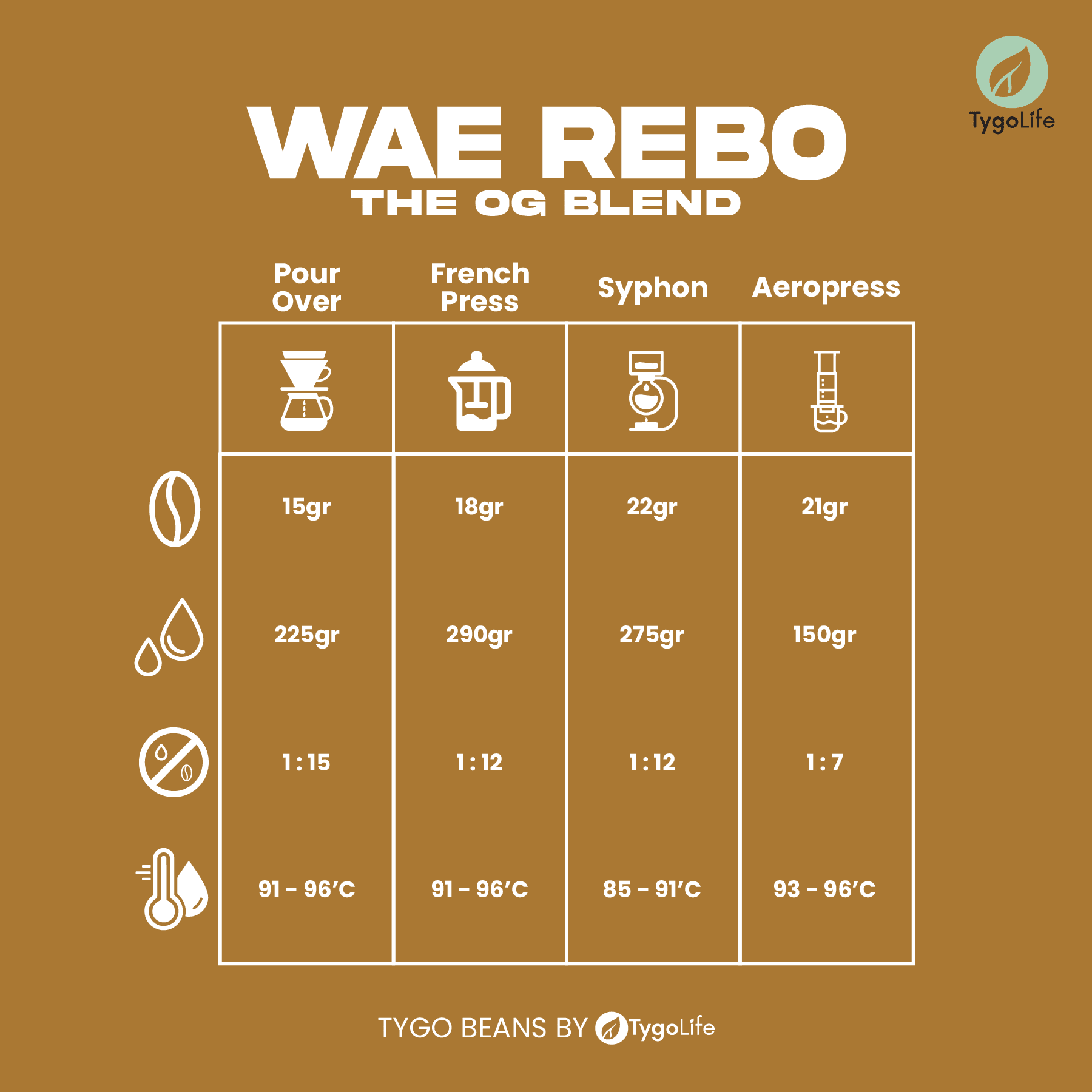Tygo Beans Wae Rebo memiliki karakteristik biji kopi yang direkomendasikan cocok untuk metode brew Espresso, Americano, Latte, Cappuccino, Kopi Susu Gula Aren.