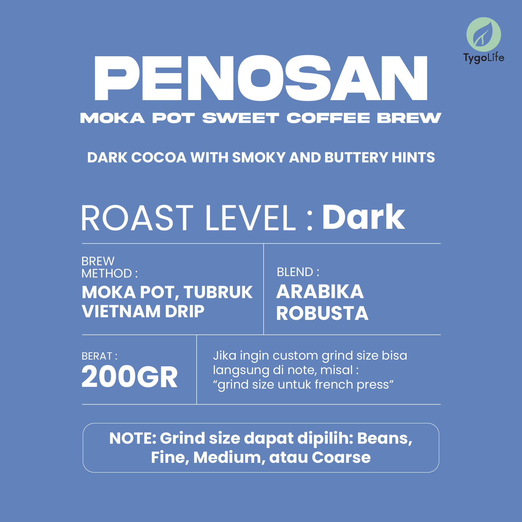 Spesifikasi: – Merek : Tygo Life – Tipe : Tygo Beans Penosan – Berat Bersih : 200gr – Blend : Arabika & Robusta – Roast Level : Dark – Notes : Dark cocoa with smoky and buttery hints – Brew Method : Moka Pot, Tubruk, Vietnam Drip – Grind Size : bisa pilih di varian