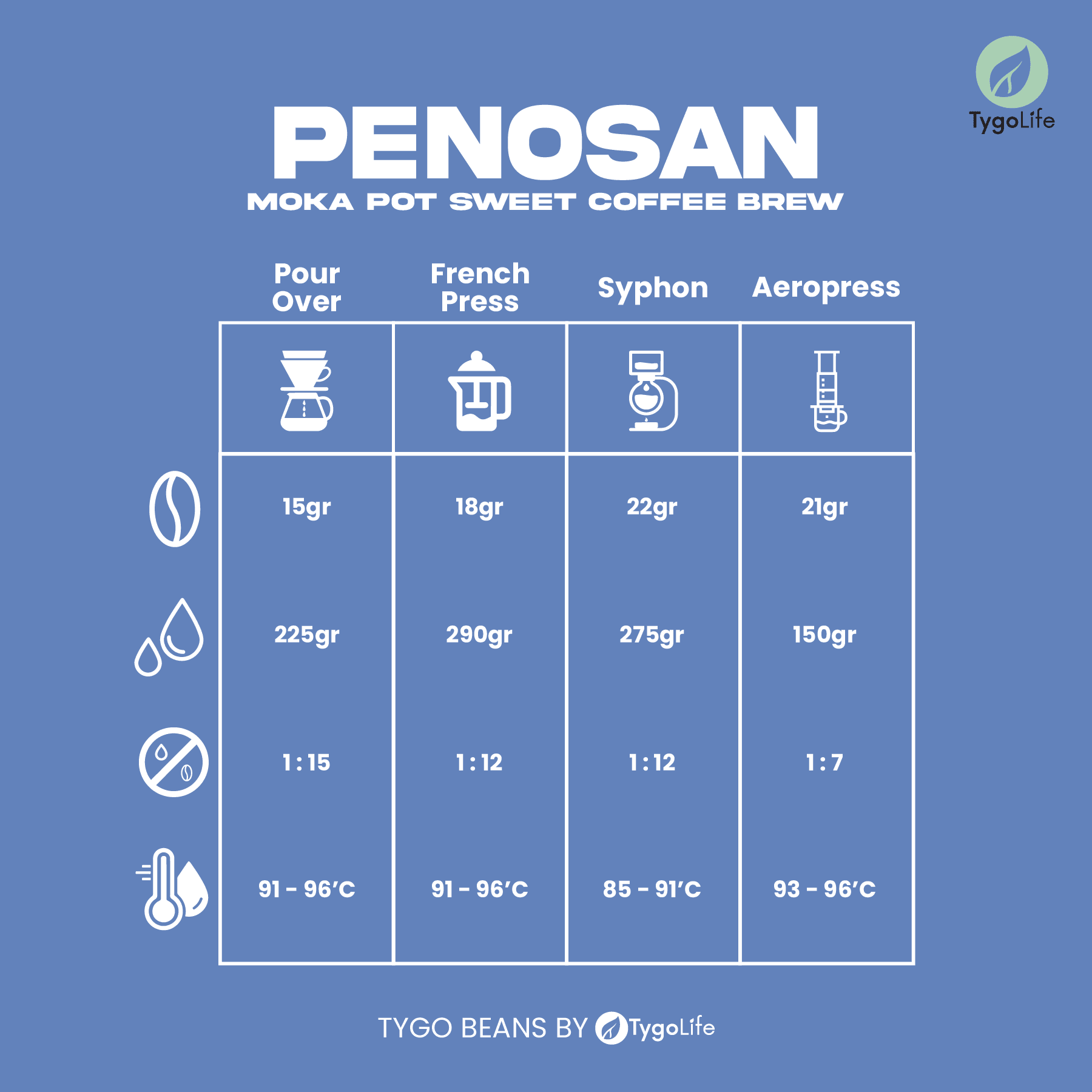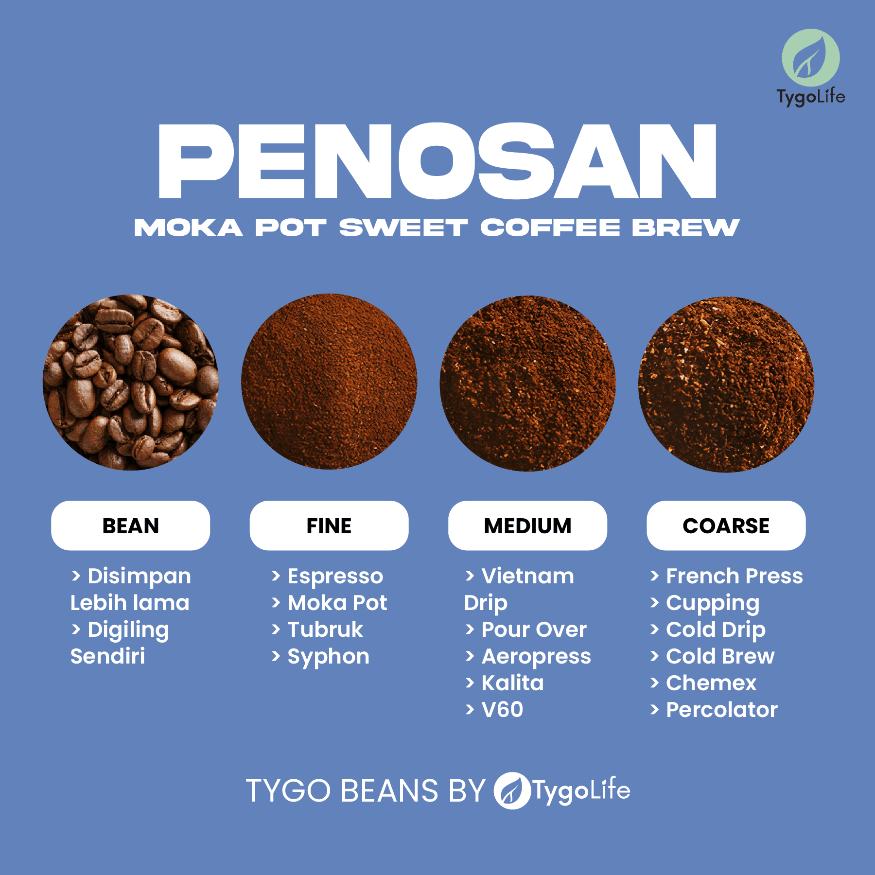 Tygo Beans Penosan memiliki karakteristik biji kopi yang direkomendasikan cocok untuk metode brew Moka Pot, Tubruk, Vietnam Drip, dan Espresso.