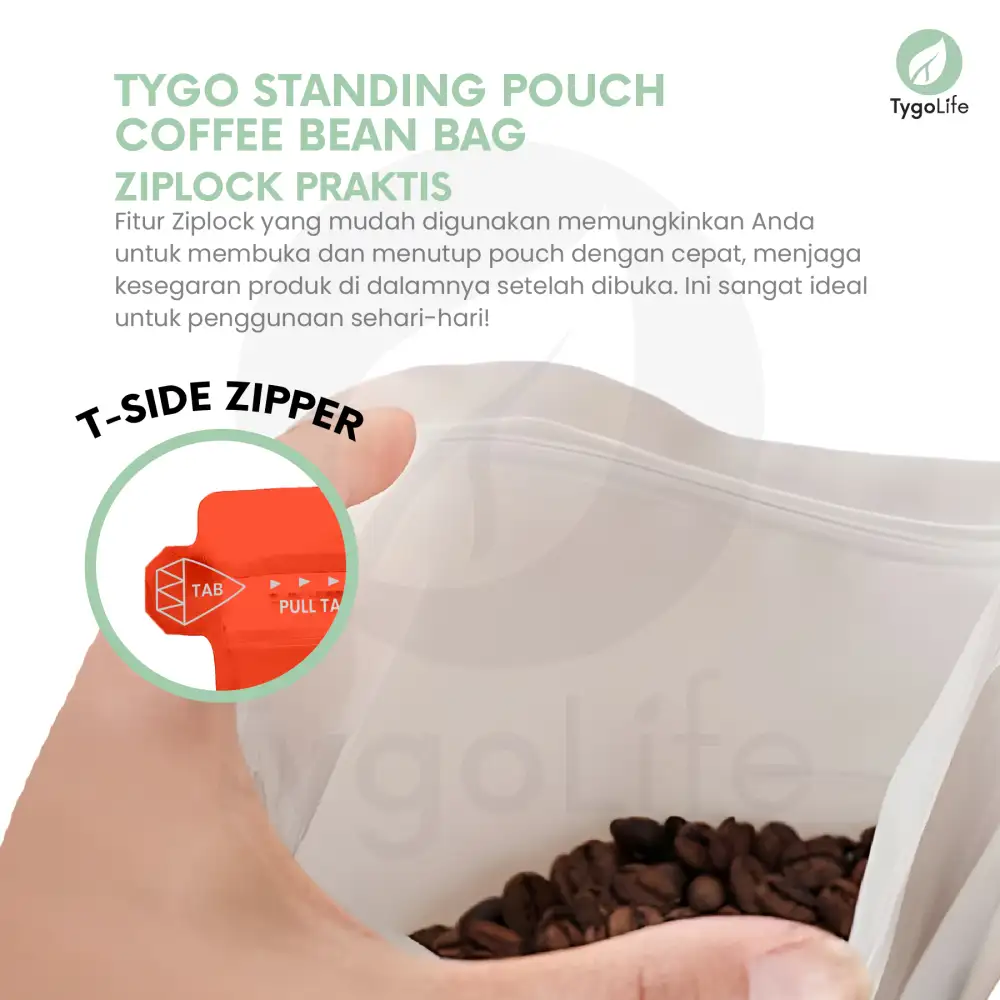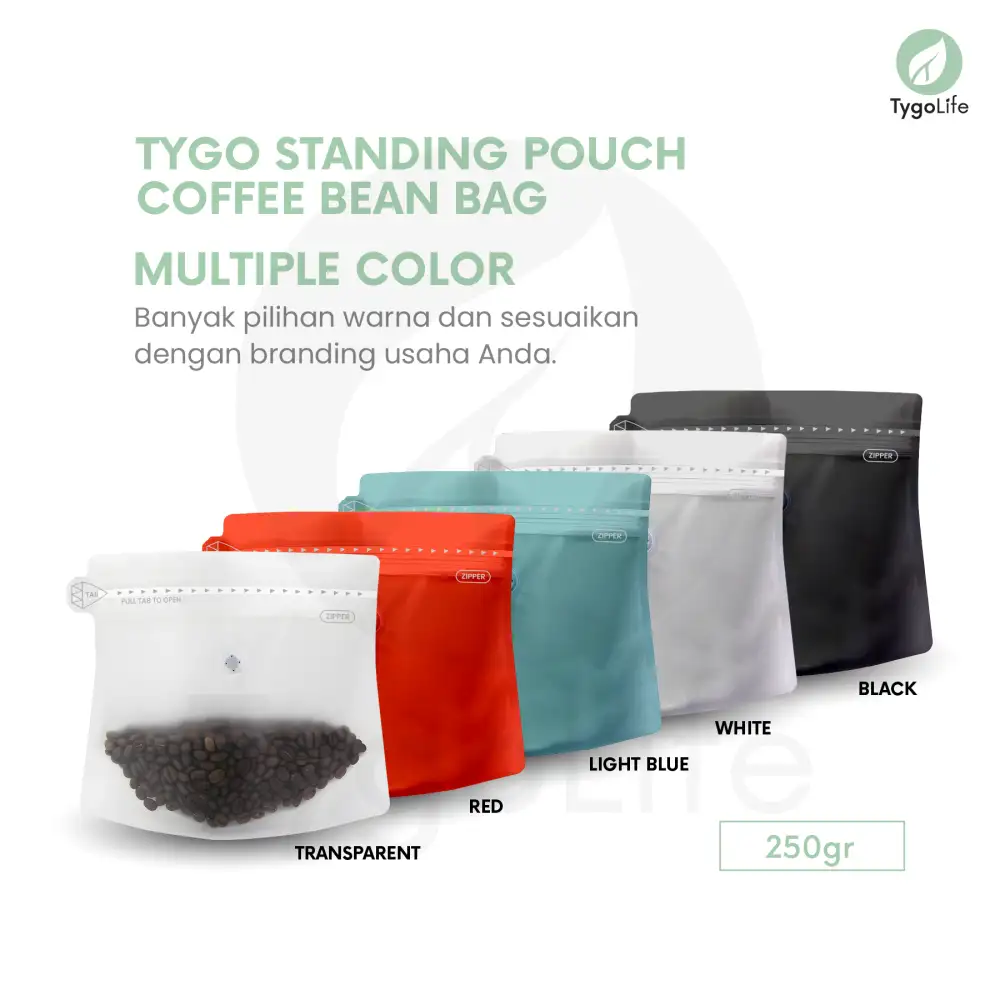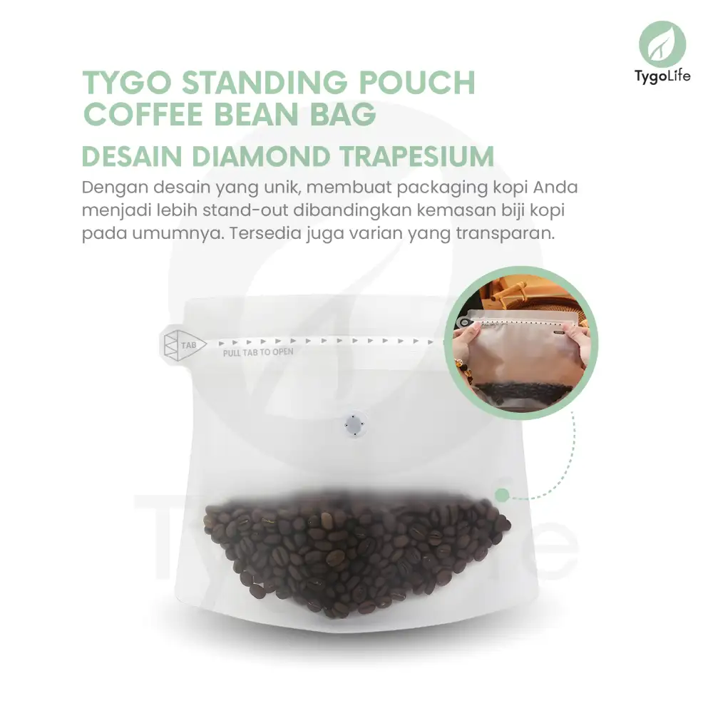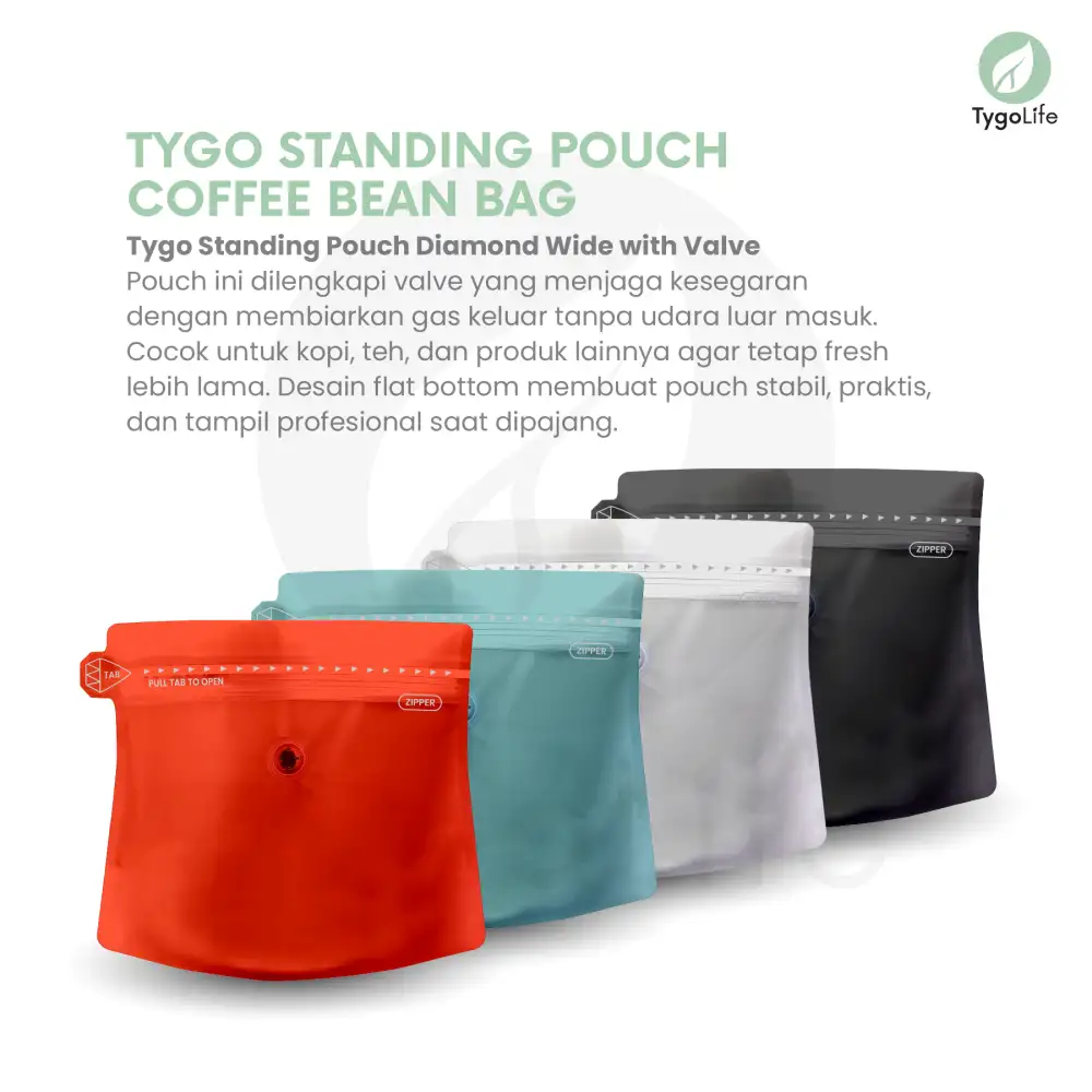 TYGO COFFEE BEAN BAG DIAMOND TRAPESIUM WIDE BOXY STANDING POUCH WITH VALVE KEMASAN ZIPLOCK PACKAGING BIJI KOPI TEH KEDAP UDARA SEGEL ALUMINIUM DOFF MATTE TRANSPARAN
