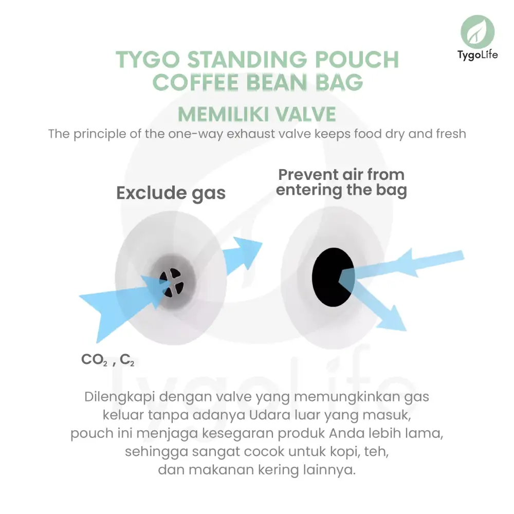 Dilengkapi dengan valve yang memungkinkan gas keluar tanpa adanya Udara luar yang masuk, pouch ini menjaga kesegaran produk Anda lebih lama, sehingga sangat cocok untuk kopi, teh, dan makanan kering lainnya.