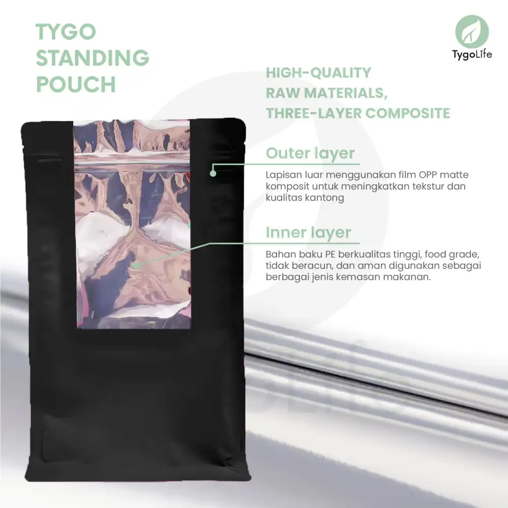 – Tipe : Tygo Standing Pouch Flat Bottom with Valve & Ziplock