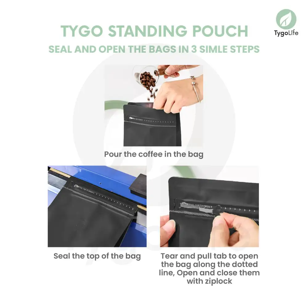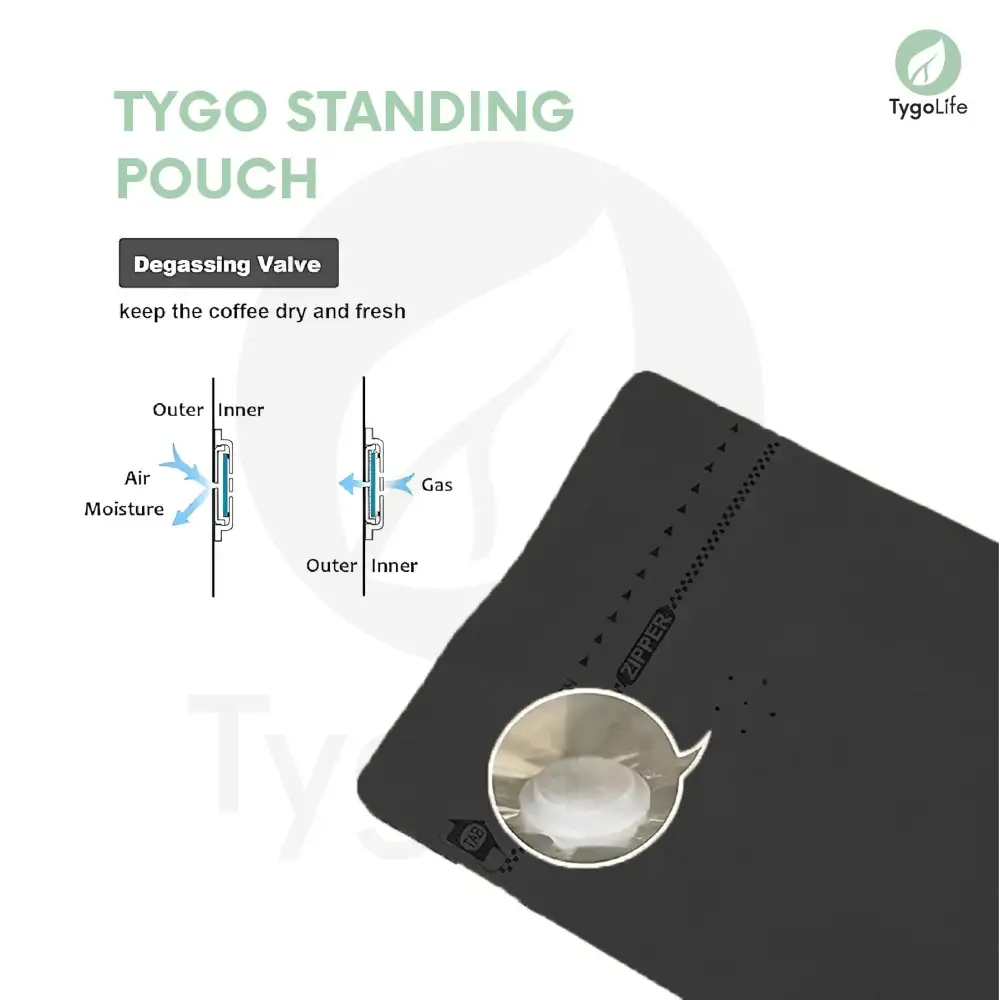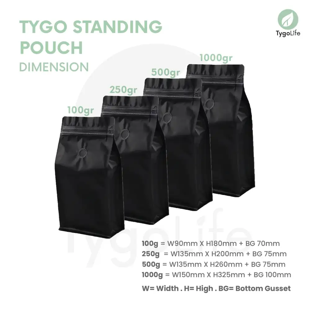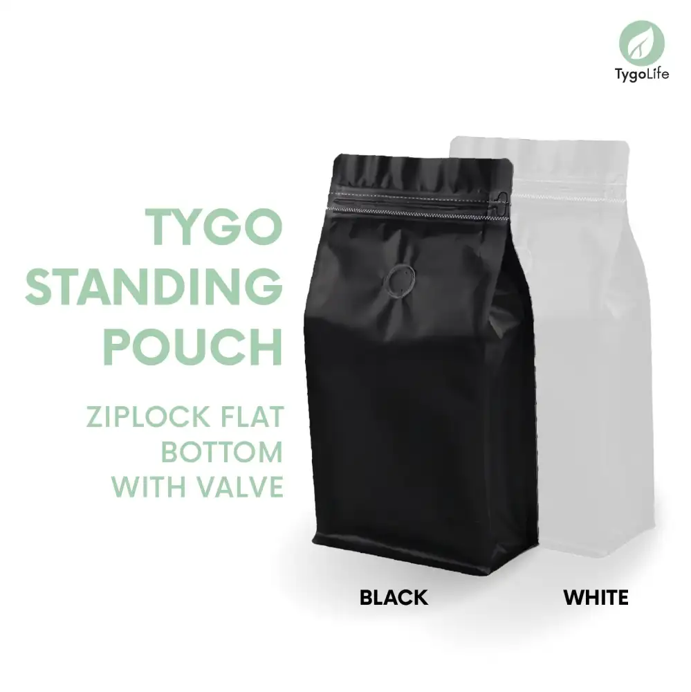 TYGO STANDING POUCH FLAT BOTTOM WITH VALVE ZIPLOCK FOR COFFEE TEA KEMASAN PACKAGING KOPI TEH KEDAP UDARA SEGEL ALUMINIUM DOFF MATTE